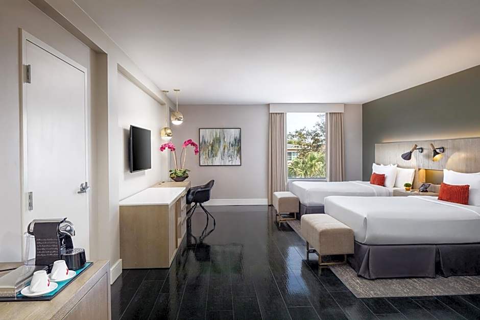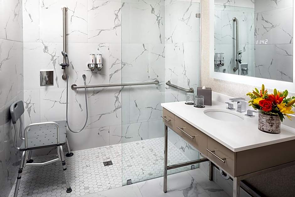 This suite has a seating area with a sofa bed, 55-inch smart TV with guest-device streaming, and tablet. The bathroom has herbal bath amenities. A Keurig coffee brewer and work desk are also included.